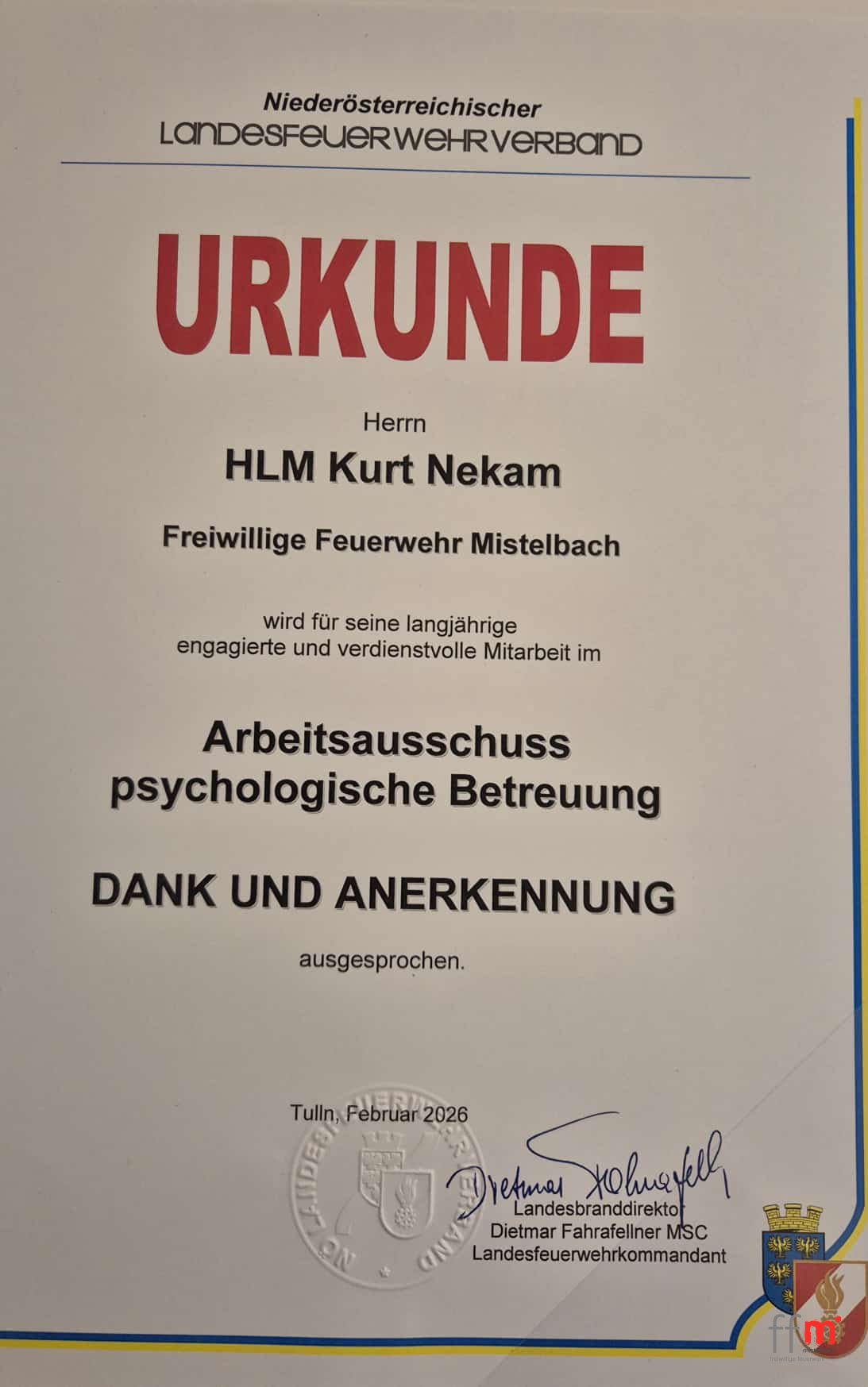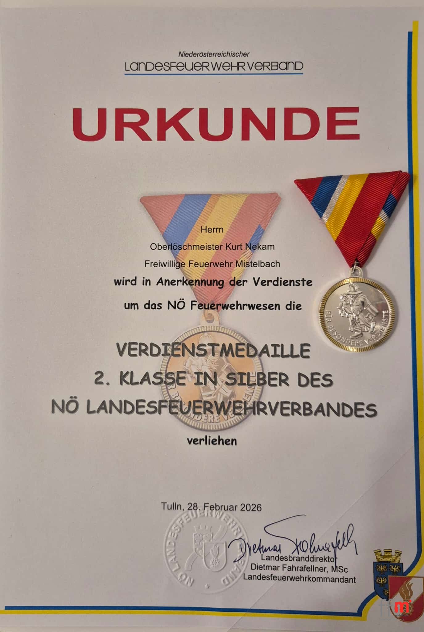 Im Rahmen einer Feier im NÖ Feuerwehr- und Sicherheitszentrum wurde unser Feuerwehrpeer HLM Kurt Nekam für seine hervorragende und langjährige Tätigkeit im Rahmen des Peerwesens mit der Feuerwehr Verdienstmedaille 2. Klasse in Silber des NÖ Landesfeuerwehrverbandes ausgezeichnet.