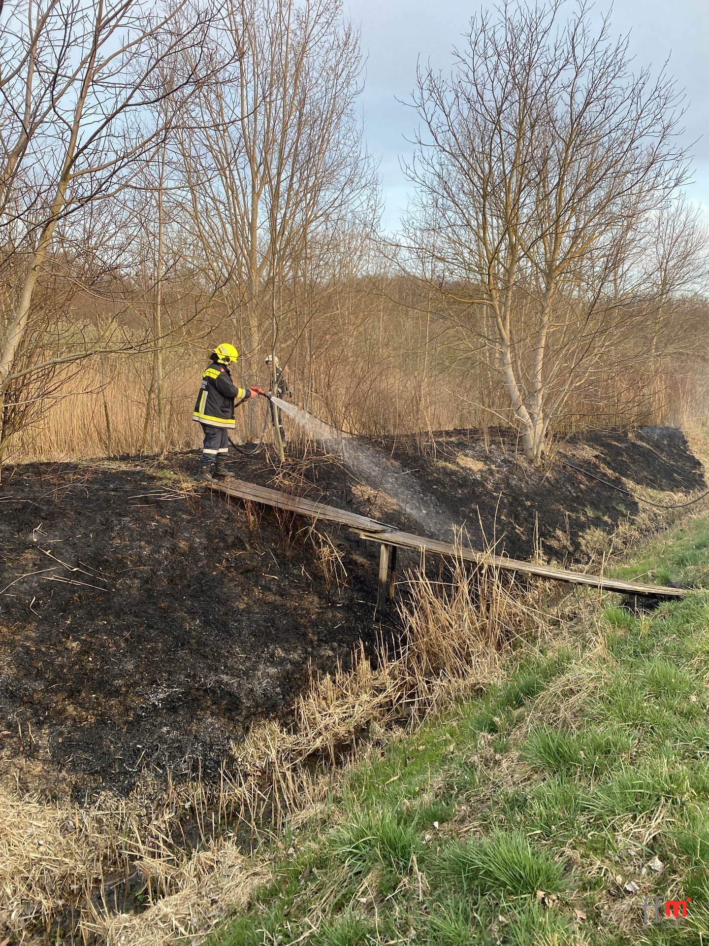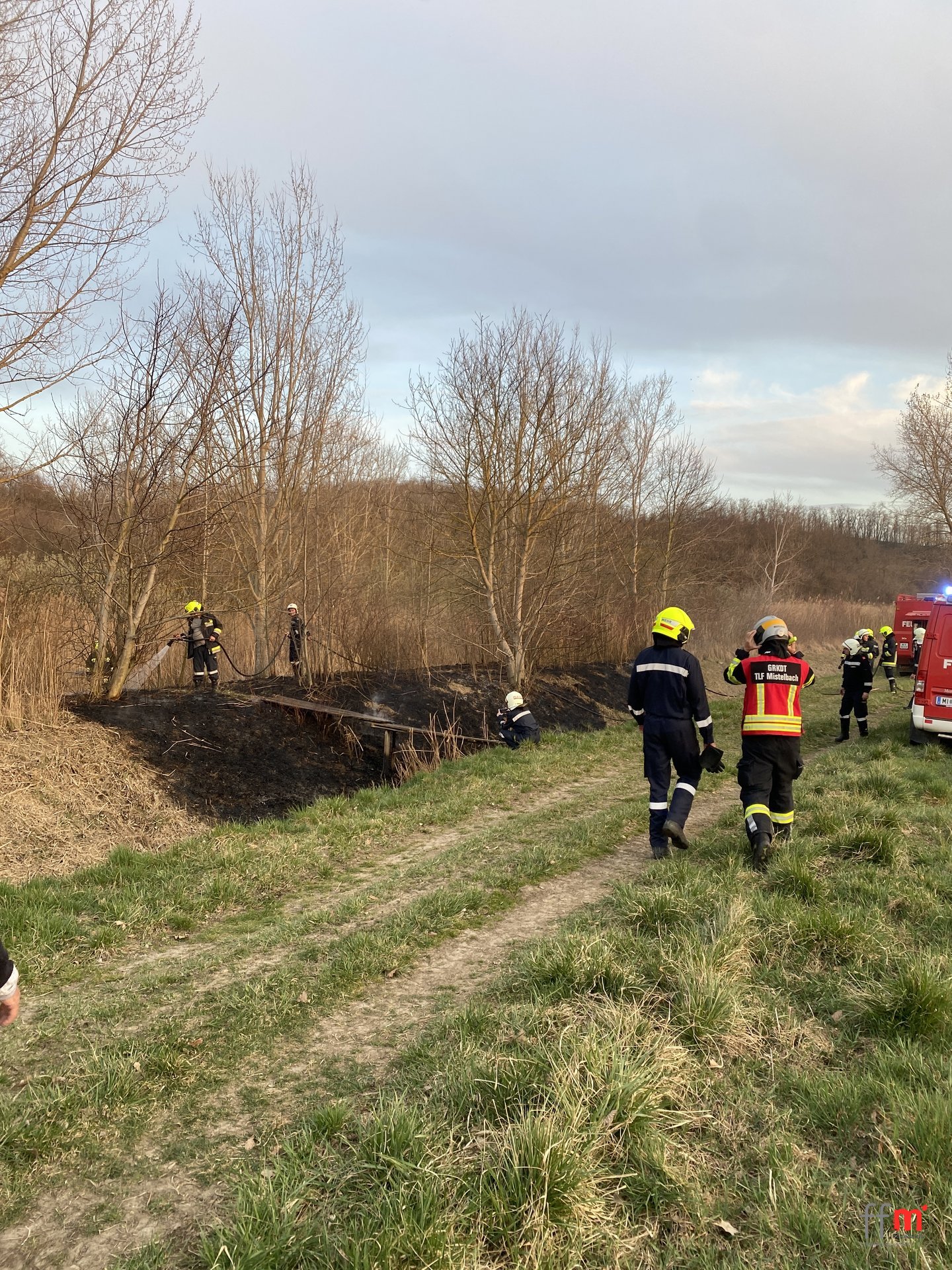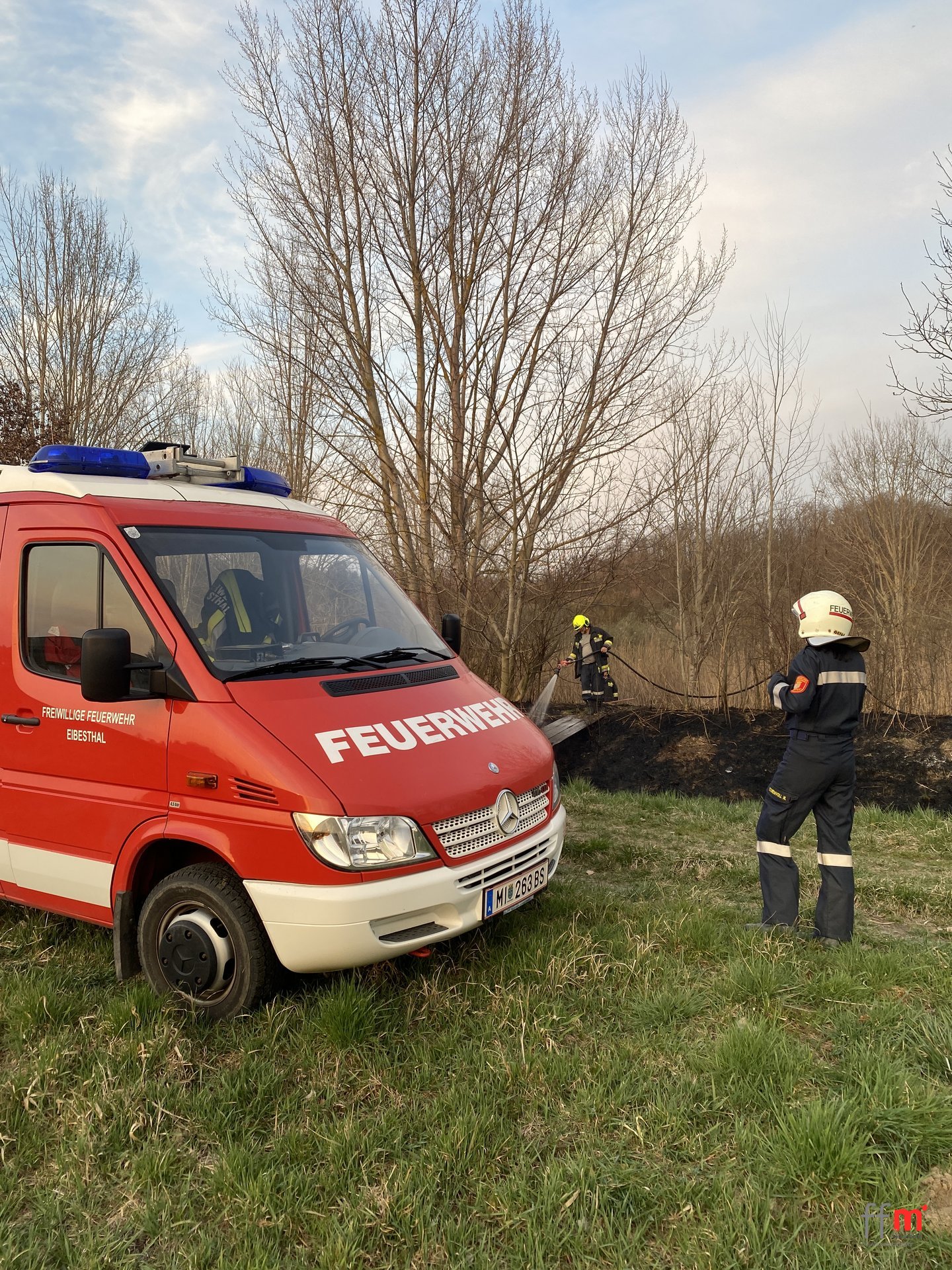 Bei unserem Eintreffen hat die Freiwillige Feuerwehr Eibesthal bereits den Brand gelöscht. Gemeinsam werden noch verbleibende Glutnester abgelöscht.