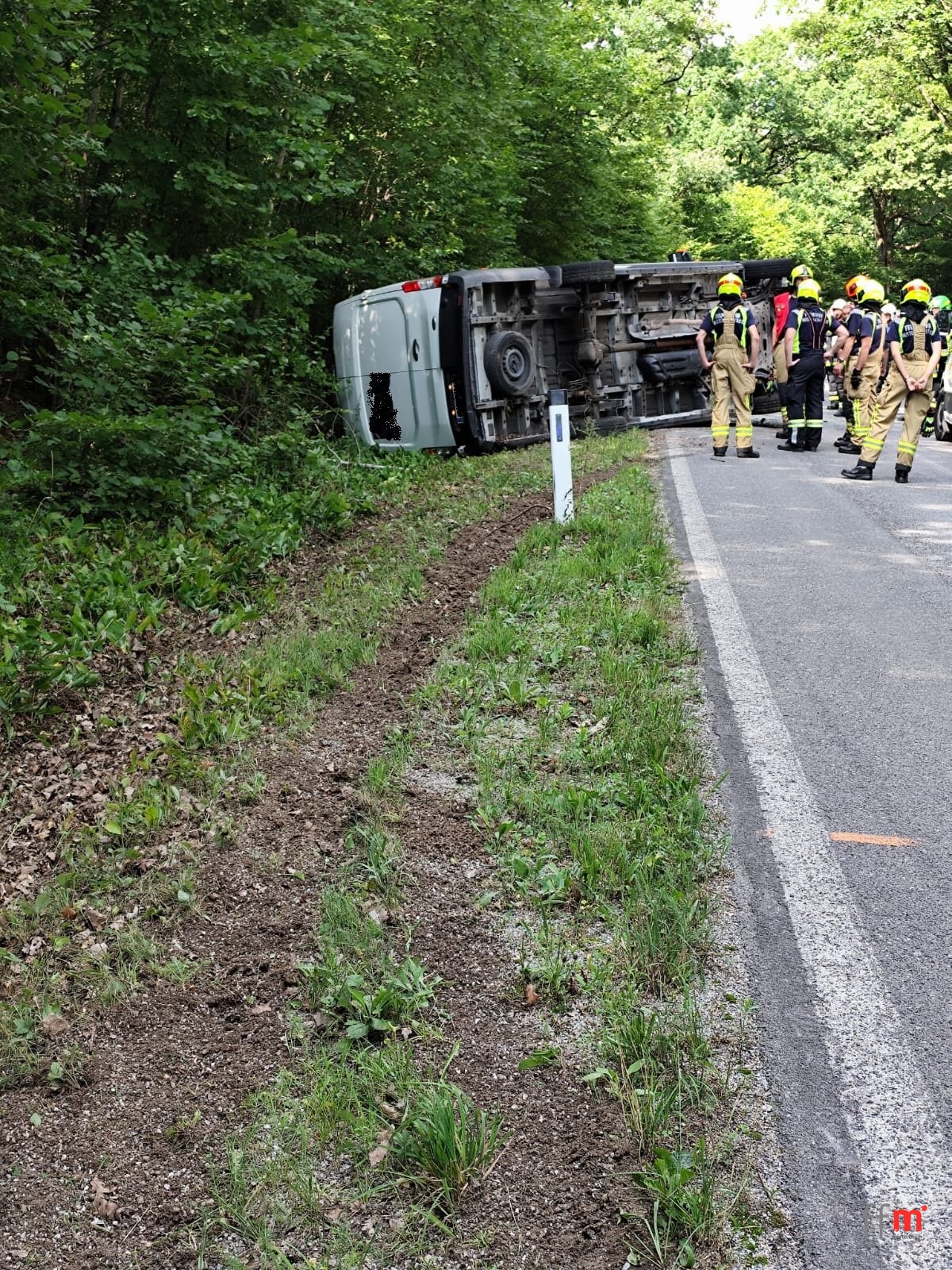 Ein Kleintransporter ist von der Fahrbahn abgekommen, umgestürzt und liegt nun auf der Fahrerseite halb in der Böschung halb auf der Straße. Als wir eintreffen sind Rotes Kreuz, Polizei und FF Kl. Hadersdorf bereits vor Ort. Die FF Poysdorf wurde auf der Anfahrt storniert.