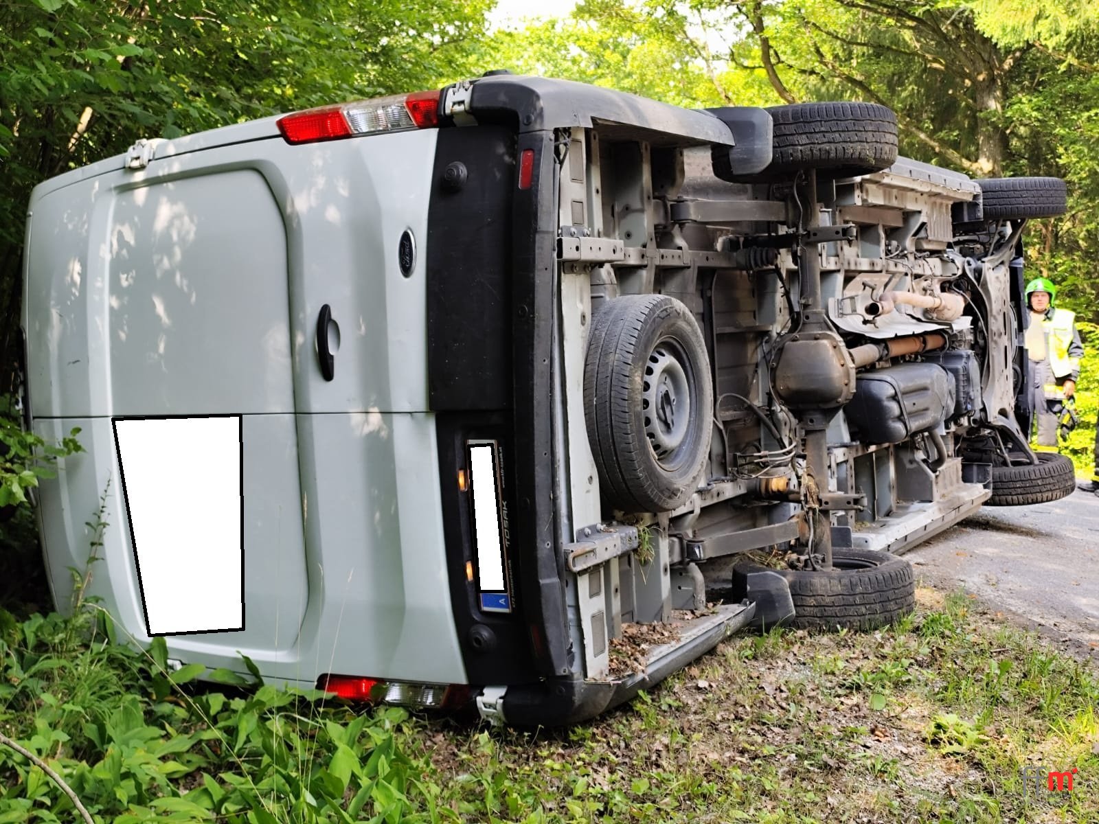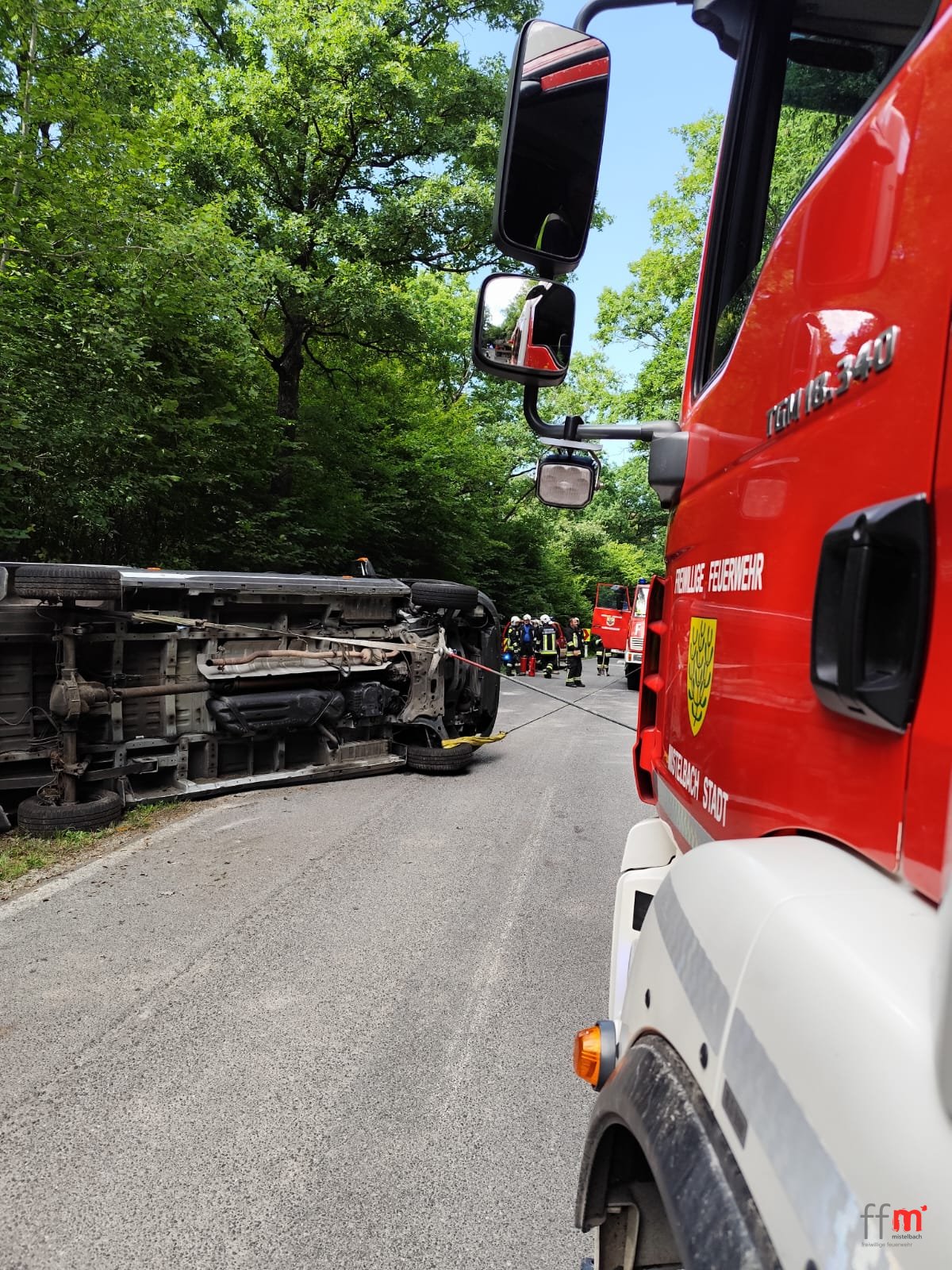 Die Insassen sind bereits aus dem Fahrzeug befreit und unverletzt. Nachdem die Polizei die Unfallstelle freigibt richten wir den Transporter mit der Seilwinde des RLF auf verladen ihn auf den Wechsellader und stellen ihn gesichert ab.
