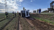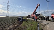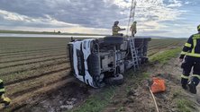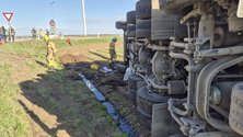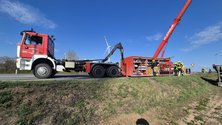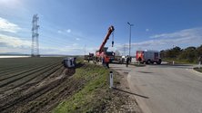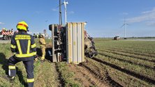 Bei einem Kreisverkehr ist ein Sattelzug von der Fahrbahn abgekommen und liegt nun mit der Beifahrerseite im Acker.
