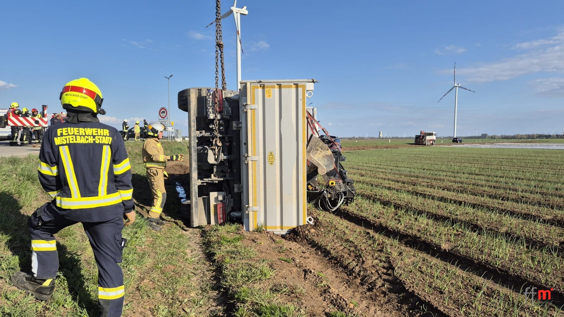Die Unfallstelle ist bereits von der Polizei abgesichert. Da die Mulde leer ist können wir den Sattelzug mit dem Kran ein Stück in den Acker heben und dann mit der Seilwinde aufrichten. Der Abtransport erfolgt durch den Besitzer.
