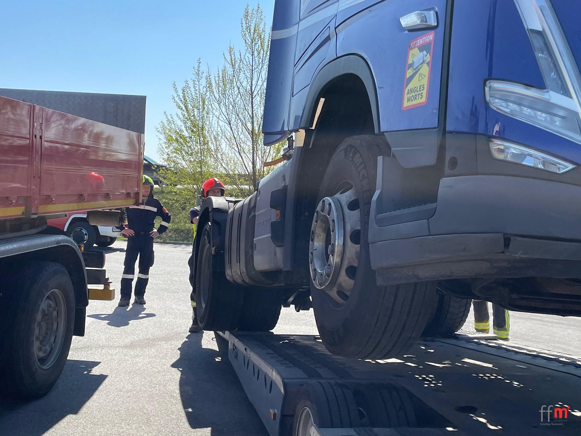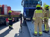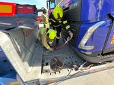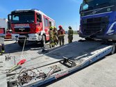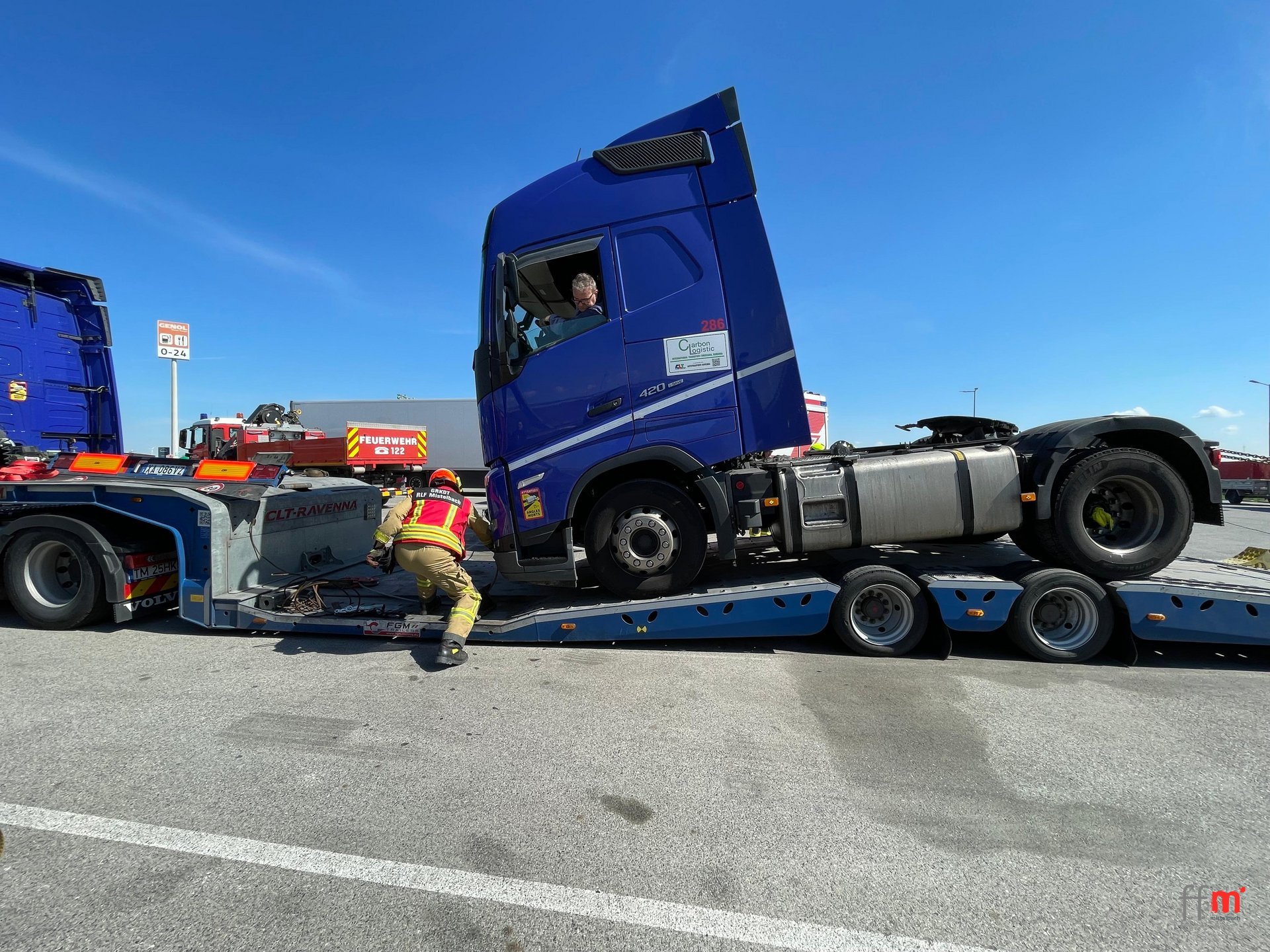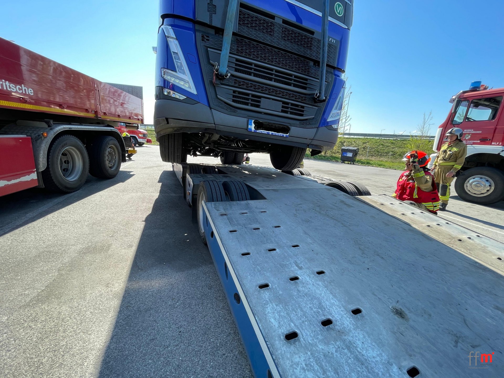 Beim Versuch eine Sattelzugmaschine auf einen Tieflader zu verladen ist diese seitlich vom Tieflader gerutscht.