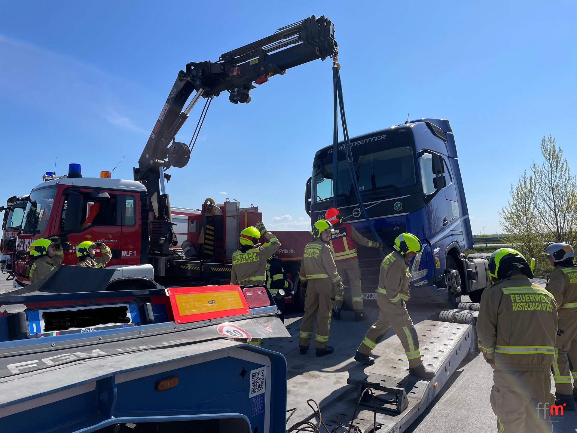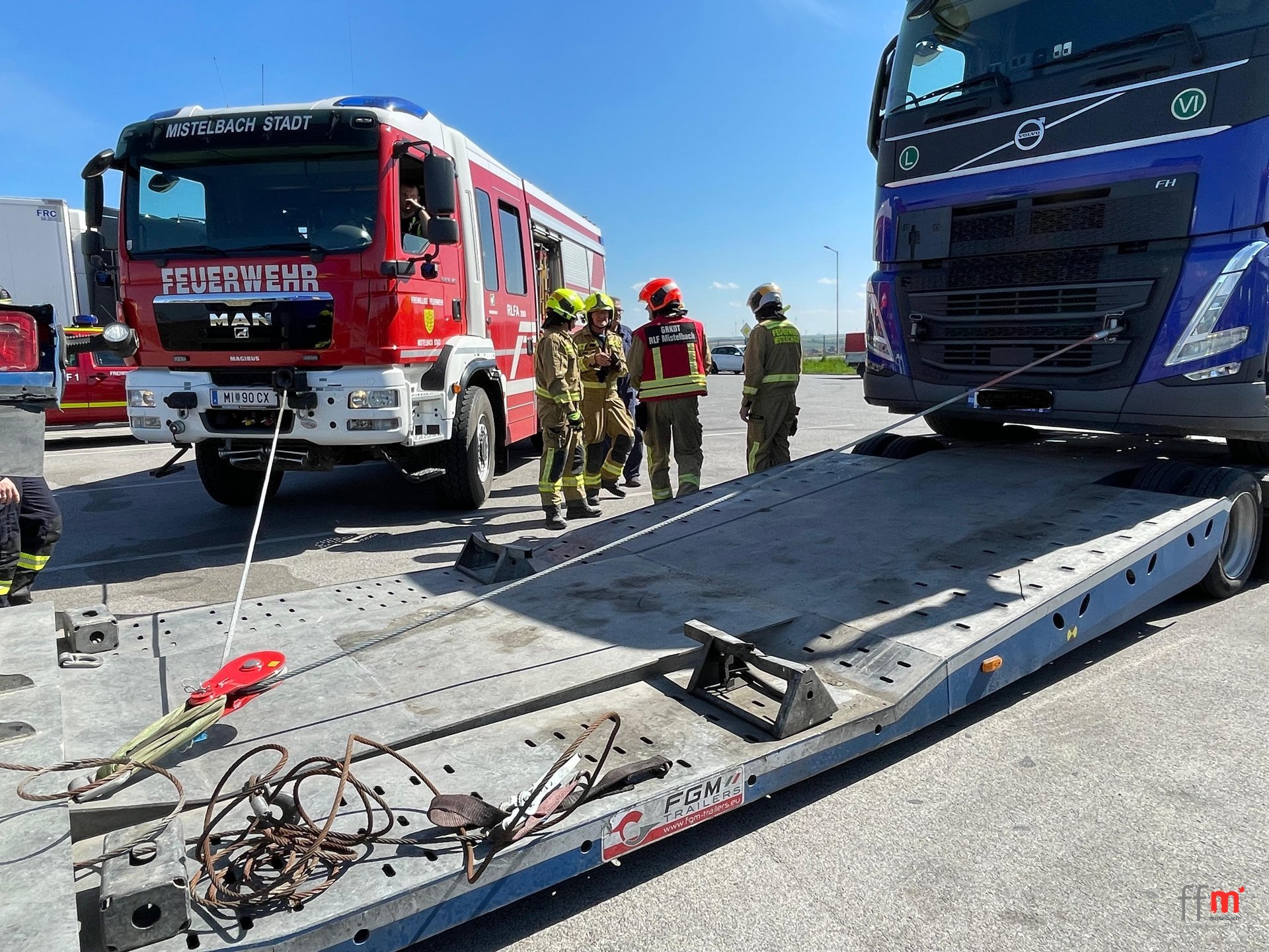 Am Vormittag werden wir zu einer LKW Bergung am Parkplatz der Genol Tankstelle gerufen.