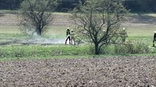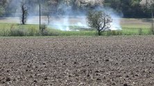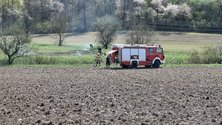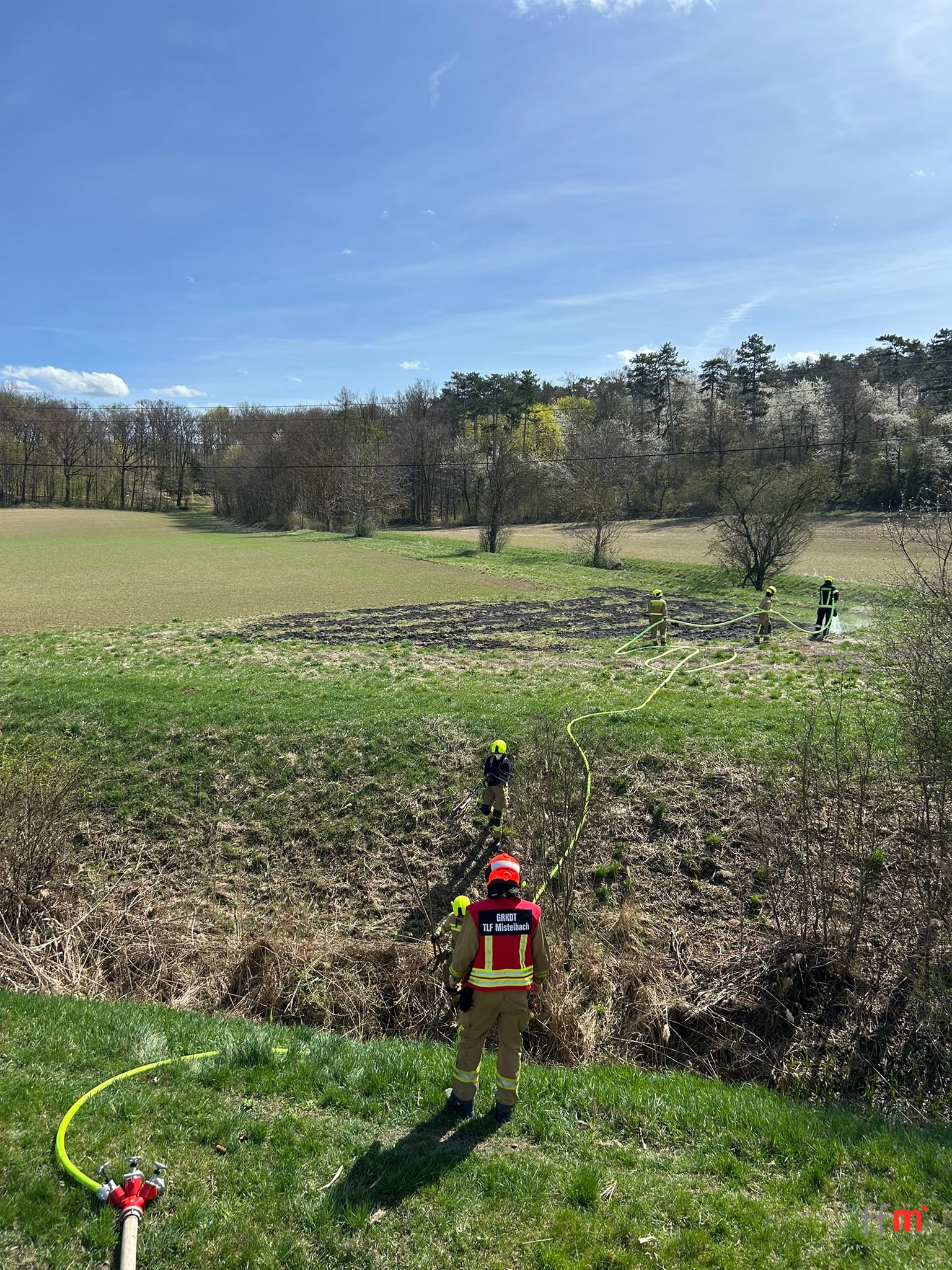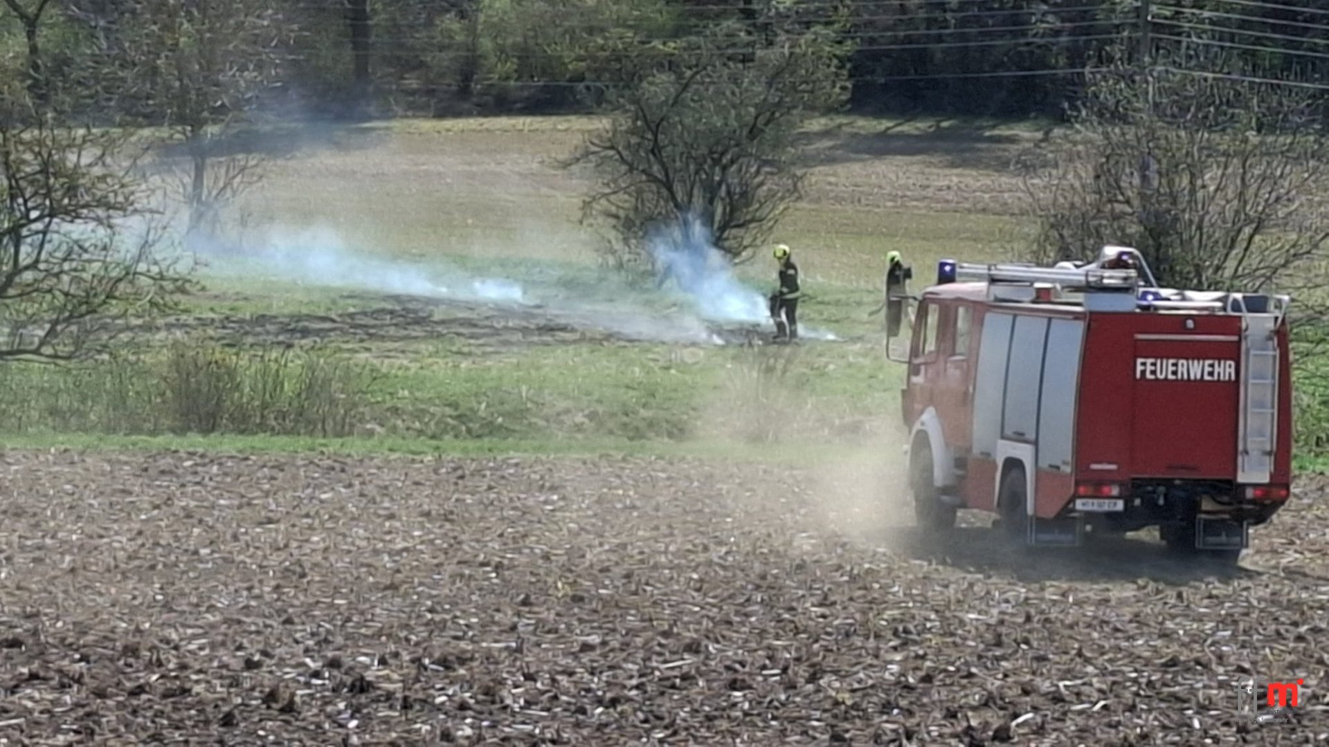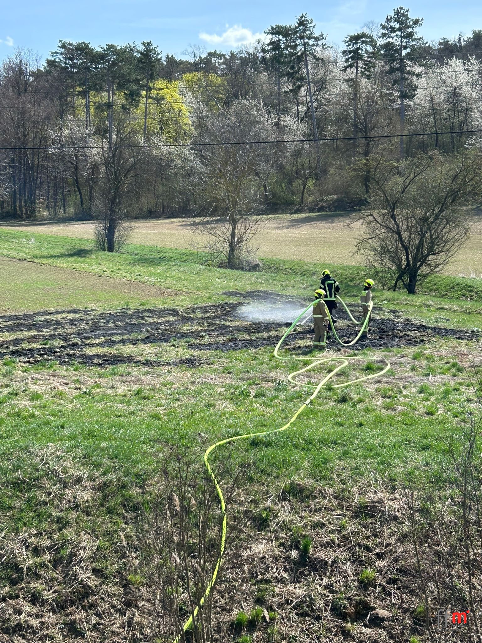 Bei unserem Eintreffen brennen und glimmen ca.: 150m² Wiese, ausgelöst vermutlich durch eine defekte Stromleitung. Wir bekämpfen das Feuer mit Feuerpatschen. Anschließend wird der Boden von uns mit Hilfe eines Hohlstrahlrohres eingewässert um ein Wiederaufflammen durch den starken Wind zu verhindern.