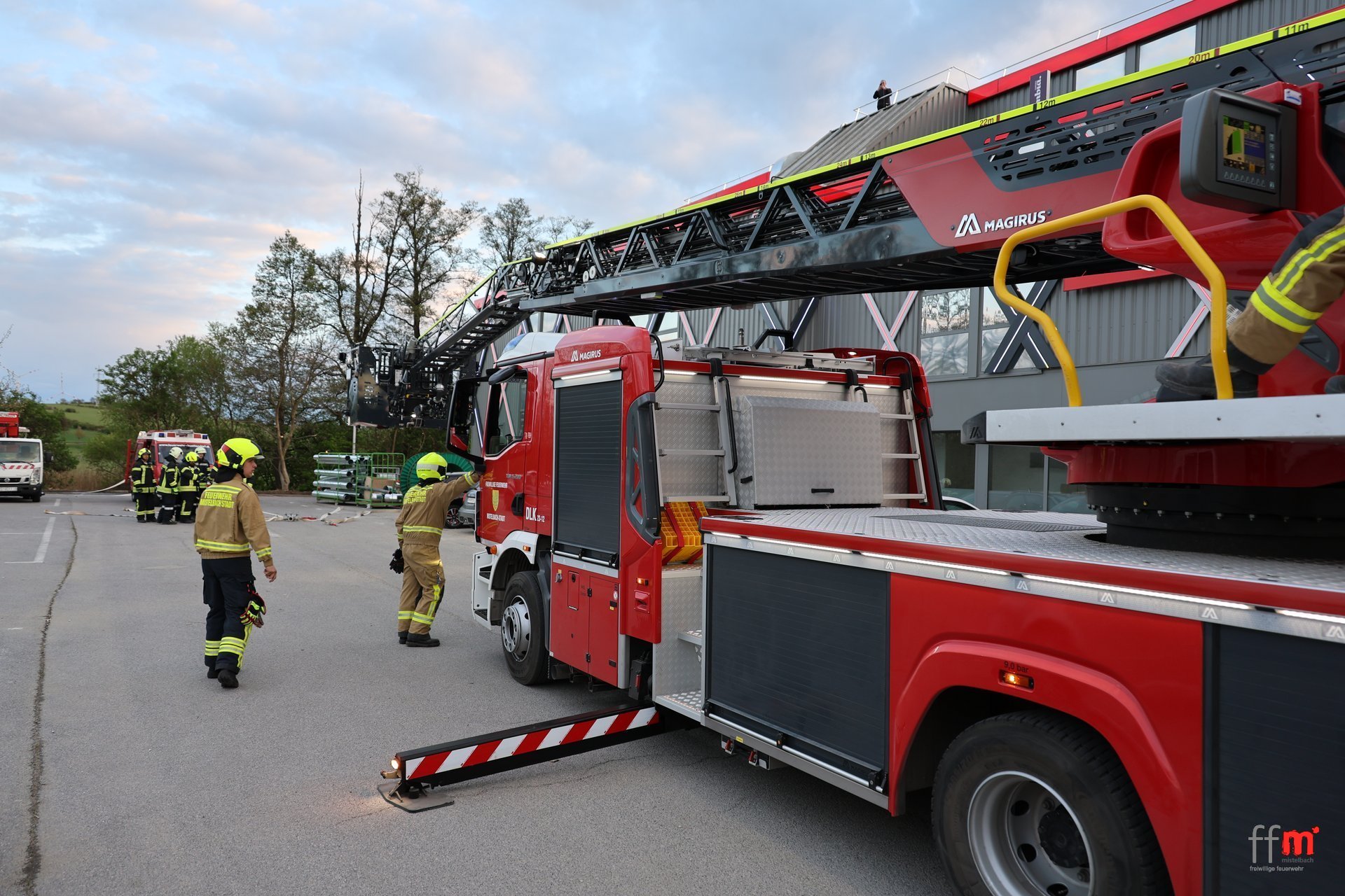 Geübt wurde unter Mitwirkung des Personals die Personensuche im weitläufigen Gebäude, die Befreiung von Personen aus dem Aufzug, Rettung von Personen mit der Drehleiter von der Terrasse, Außenangriff mit Tragkraftspritze, Außenangriff über die Drehleiter und deren Wasserversorgung, .....